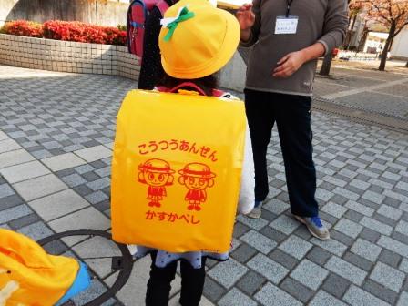 1年生の付けているランドセルカバーは、春日部市の伝統工芸品である麦わら帽子の