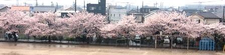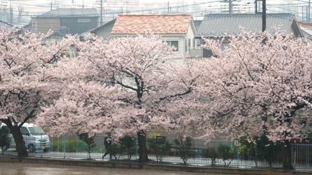 雨に打たれながらも、桜がきれいに咲いています。だいぶ花びらが落ちてきています。