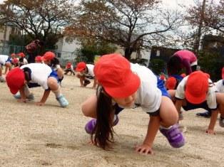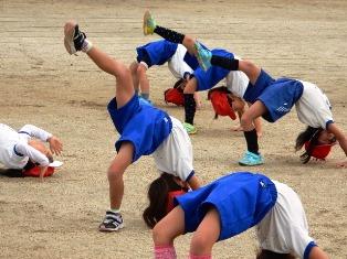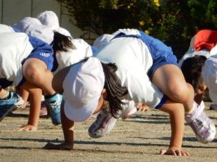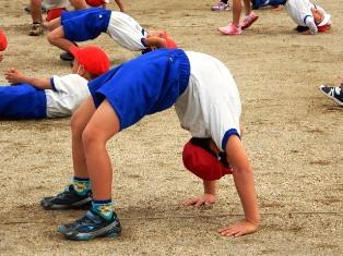 準備運動のかえる倒立、1年生が上手に出来るようになってきました。