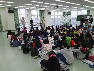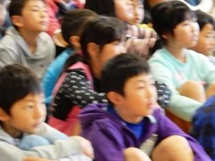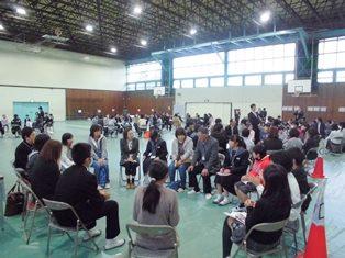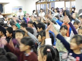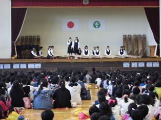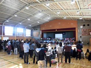豊春中学校体育館で、宮川小学校と豊春小学校の全校児童が