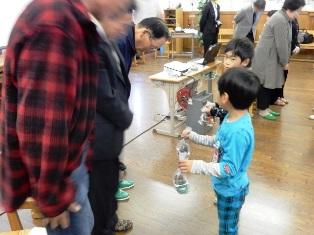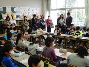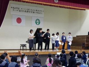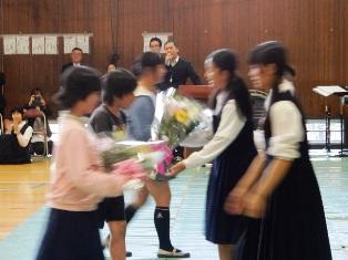 宮川小、豊春小の児童がお礼の花束を渡しました。