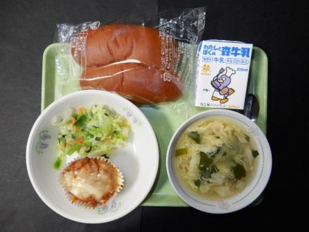 黒パン、ポテトのミートソース焼き、フレンチサラダ、たまごスープ、牛乳です。