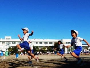秋空の下、朝マラソンに取り組む子どもたちです。