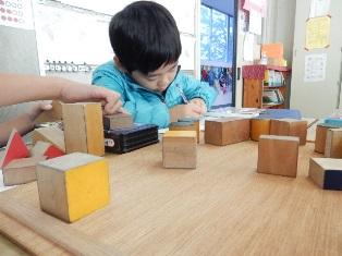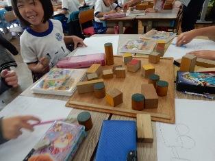 種類の立体を見て、触って、書いています。うれしそうですね。