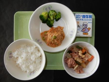 ごはん、揚げ出し豆腐の甘酢あんかけ、ブロッコリーみそドレッシング、ぶた肉と大根の煮物、牛乳です。