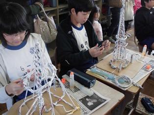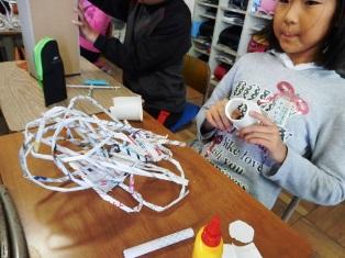 6年生はチラシなどを丸めて棒状にして作品を制作しています。