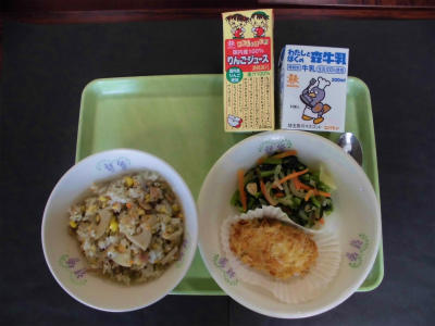 れんこんピラフ 牛乳 白身魚のこんがり焼き 野菜ソテー リンゴジュース