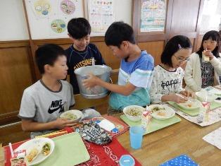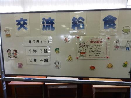 今日は2年4組と4年3組の交流給食です。
