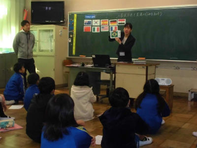 5年 外国語:英語専任教師の授業です。どこの国なのか、国旗を見て答えています。