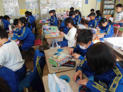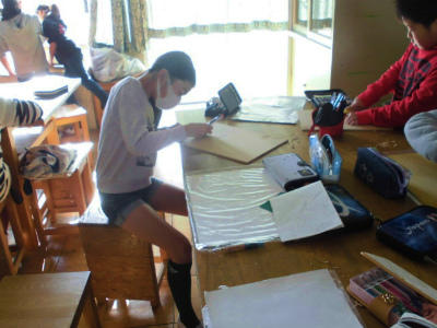 5年 図工:版画です。彫刻刀を使って作業をしています。