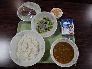 献立は、麦ごはん、牛乳、小江戸カレー、小松菜とじゃこのサラダ