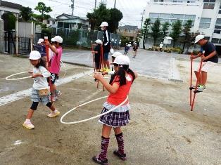 フラフープで遊ぶ子どもたちなど、体を動かして遊ぶ子どもたちです。