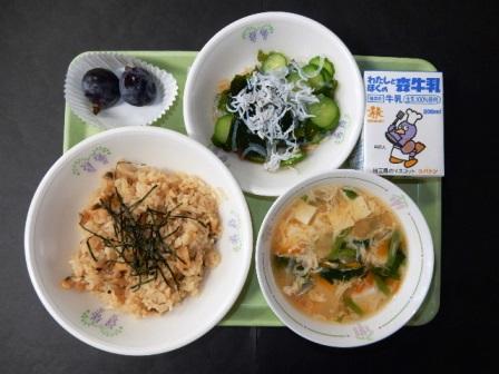 あなごめし、きゅうりの酢の物、かきたま汁、巨峰、牛乳です。