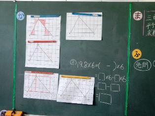 5年生は算数の授業で、三角形の面積の求め方を考えています。