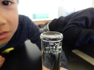 お湯で暖めると試験管の入口で水が盛り上がっていますね。