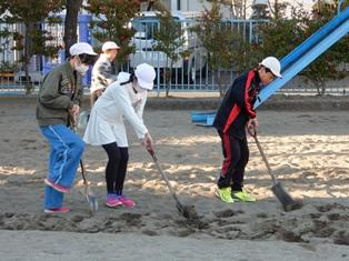 朝マラソン前から運動委員会の皆さんが砂場の砂を掘り起こしています。