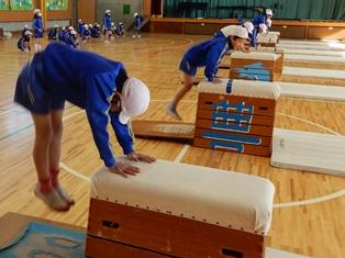 3年生は体育の跳び箱の練習です。まずは、踏切板でジャンプ。