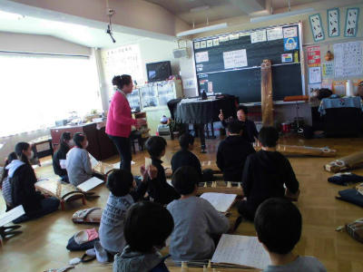 6年生がクラス毎に、音楽室で箏をひく体験をしました。