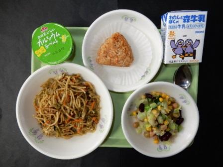 焼きそば、海の幸いっぱい焼きおにぎり、ビーンズサラダ、ヨーグルト、牛乳です。