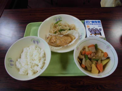 ごはん、牛乳、さわらの梅ねぎ焼き、もやしとピーマンのおひたし、筑前煮