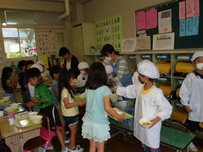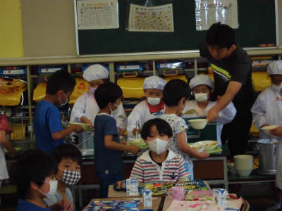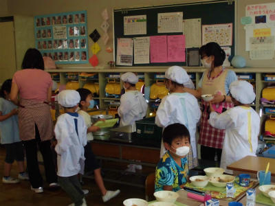 1年生も、担任の見守りのもと、自分たちで配膳しています。