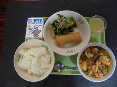 ごはん 牛乳 海鮮春巻き 小松菜とじゃこのあえもの マーボー豆腐 りんごゼリー