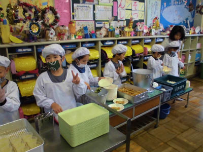 今日は1年生の給食の配膳の様子を保護者の方に見てもらいました。