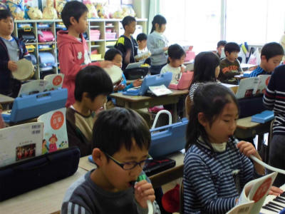 2年生の音楽の授業の様子です。役割を決めて演奏会をしていました。