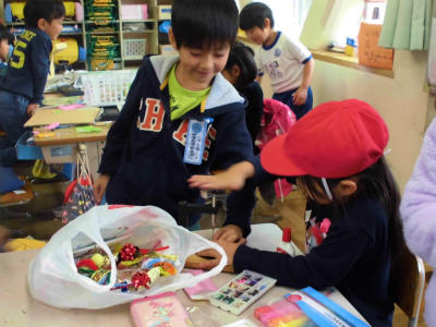 1年生、どんぐりに穴を開けています。何を作っているのかな?