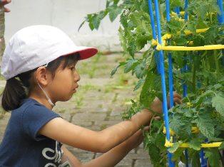 2年生がとても真剣な表情で、栽培しているトマトの世話をしています。
