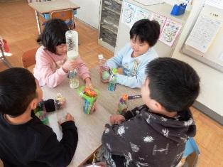 678組は、合同で図工の授業です。ペットボトルで砂時計を