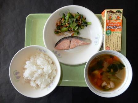 ごはん、さけの塩焼き、煮びたし、紅白すいとん、オレンジジュースです。