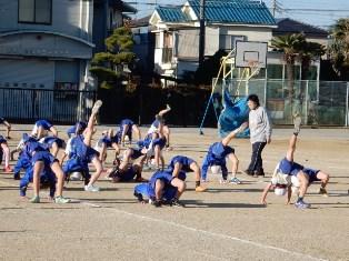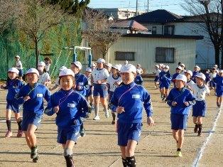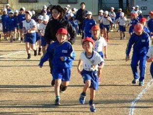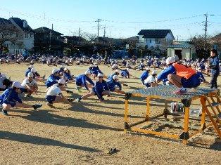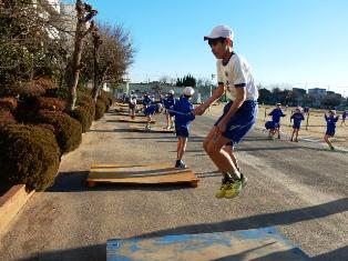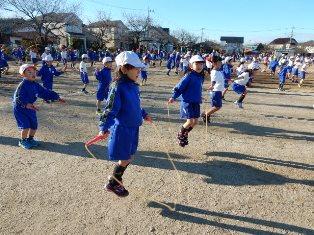朝マラソン前に縄跳びに挑戦している子どもたちが大勢います。