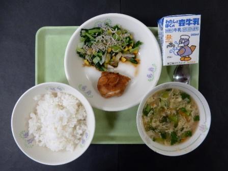 ごはん、とり肉のありの実ソースかけ、青葉とじゃこのサラダ、五目スープ、牛乳です。