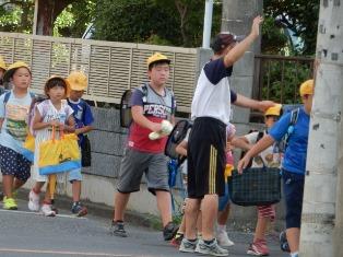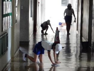 いつものように6年生が1階廊下の雑巾がけをしています。