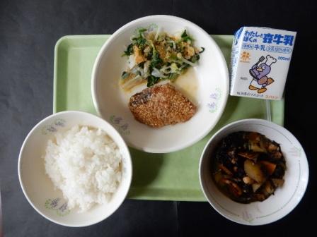 ごはん、かつおのごま風味揚げ、ほうれんそうのピーナッツみそ和え、磯煮、牛乳です。