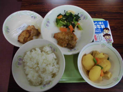 5月14日 ごはん、牛乳、とり肉の七味焼き、小松菜とエリンギの炒め物、新じゃがのそぼろ煮