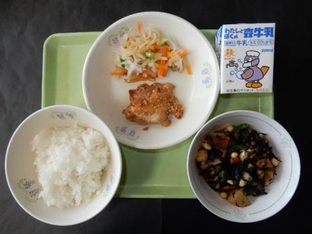 ごはん、とり肉のごま焼き、即席漬け、磯煮、牛乳です。
