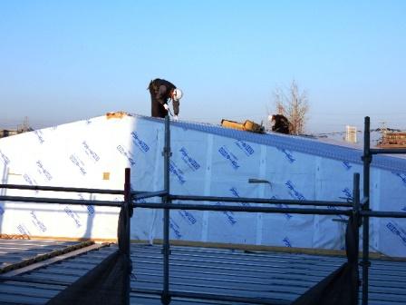 体育館の屋根の工事は、昨日で半分、今日で、ほぼ葺き終わったように見えます。