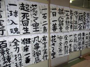 5年生の掲示板には、毛筆で書かれた力作が掲示されています。