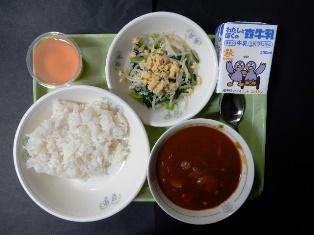 本日の献立は、ごはん、かに玉、野菜炒め、麻婆豆腐、牛乳です。