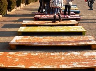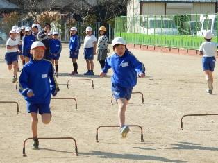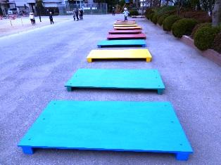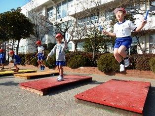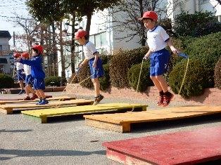 職員が新しく製作した縄跳び用の台で1年生が縄跳びの授業です。