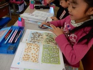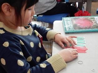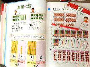 1年生は算数の授業で、算数セットの中から数字のカードを