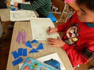 6年生は算数の授業で、三角柱、四角柱、五角柱の様子を調べ、