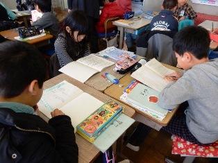 今日は雪のため校庭に行けないので、図書室で読書や本を