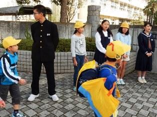 一緒にあいさつしている6年生は、半年で中学生ですね。