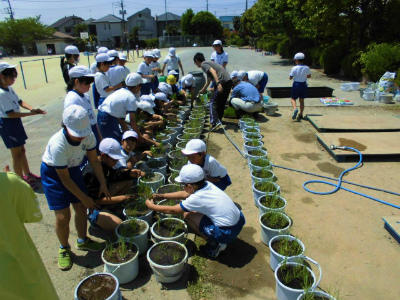 5年生 社会 総合 バケツで稲を育てます。いつも地域の支援者渡辺様が、稲の植え方や育て方を教えてくださいます。お米が食べられることを期待して、育てていきます。
