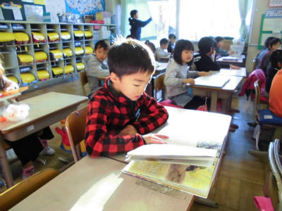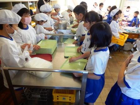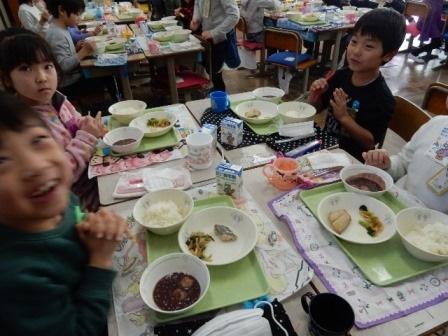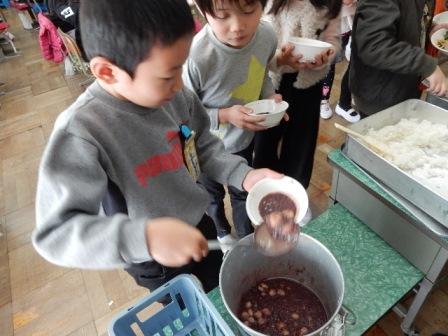 おしるこ、おかわりです。この時期になると、1年生も給食の準備など慣れたものです。