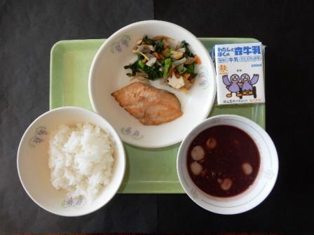 ごはん、さわらの照り焼き、五目きんぴら、おしるこ、牛乳です。