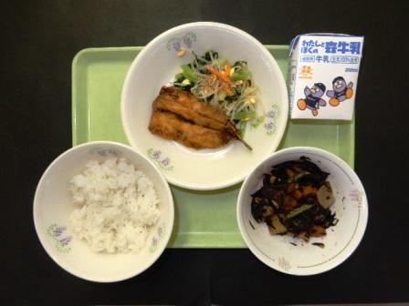 ごはん、いわしのピリ辛揚げ、もやしの中華あえ、磯煮、牛乳です。